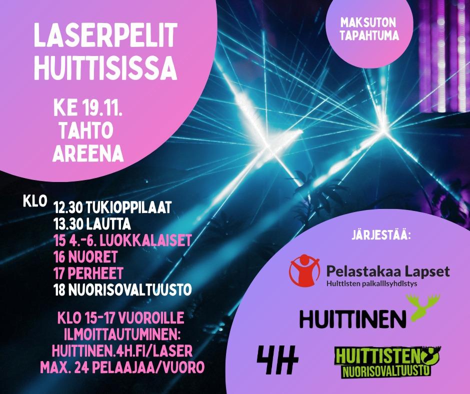 Huittisten Pelastakaa Lapset ry yhteistyössä Huittisten kaupungin, Nuorisovaltuuston ja 4H-yhdistyksen kanssa toteuttaa Laserpeli-tapahtuman Tahto Areenalla keskiviikkona 19.11.2025.